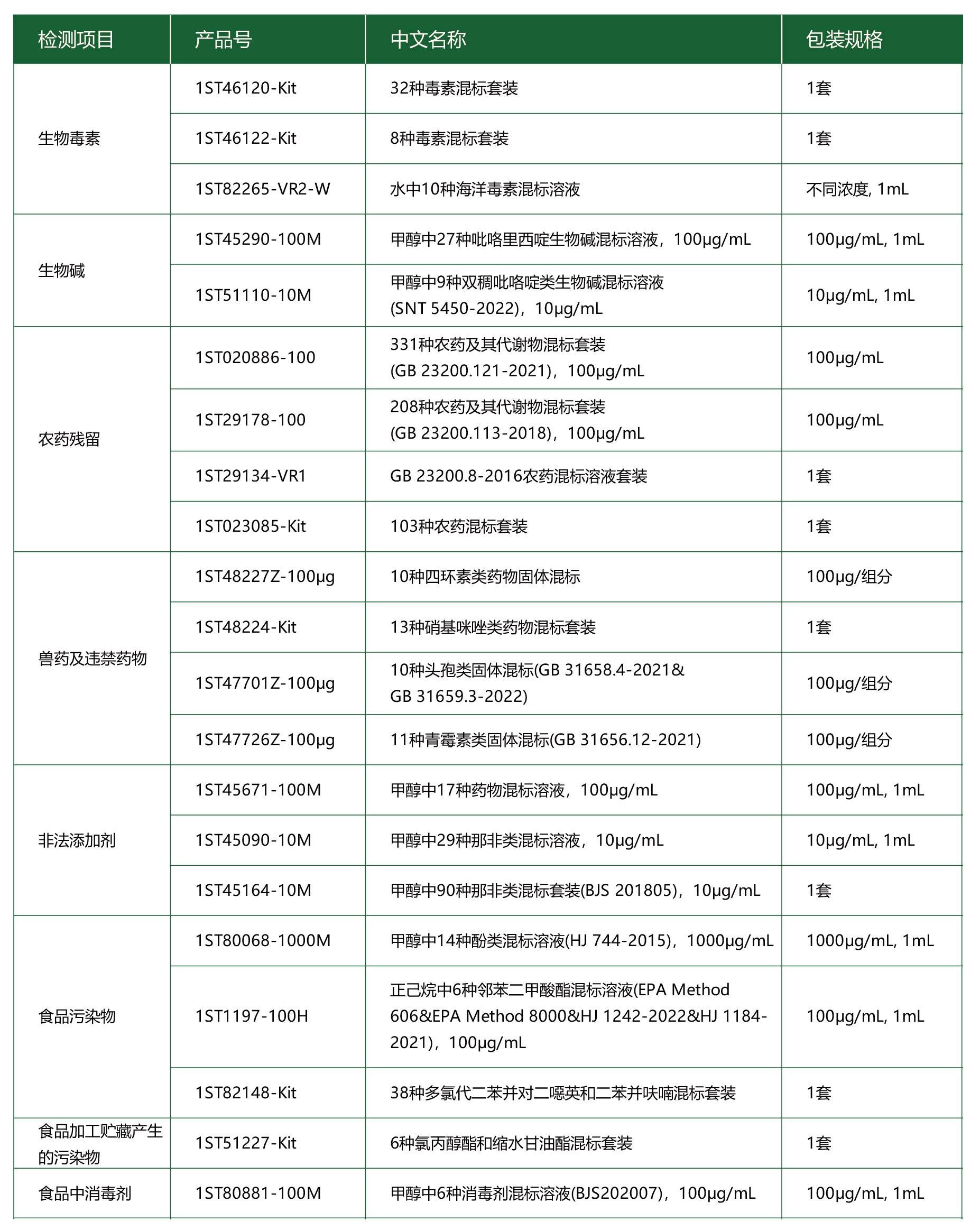 食品安全監(jiān)管部門會(huì)按照相應(yīng)的國(guó)家標(biāo)準(zhǔn)對(duì)不同樣本開展相關(guān)的風(fēng)險(xiǎn)因子監(jiān)測(cè)項(xiàng)目。阿爾塔科技作為CNAS認(rèn)可的國(guó)產(chǎn)標(biāo)準(zhǔn)物質(zhì)生產(chǎn)者,結(jié)合國(guó)家檢測(cè)標(biāo)準(zhǔn)和行業(yè)需求,推出食品中風(fēng)險(xiǎn)因子檢測(cè)標(biāo)準(zhǔn)物質(zhì)解決方案,為開展食品安全風(fēng)險(xiǎn)評(píng)估和標(biāo)準(zhǔn)制定、風(fēng)險(xiǎn)預(yù)警和交流等提供技術(shù)支持。