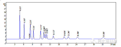 出峰順序:1. 甲醛-DNPH,2. 乙醛-DNPH,3. 丙酮-DNPH +丙烯醛-DNPH,4. 丙醛-DNPH,5. 丁烯醛-DNPH,6. 丁酮-DNPH,7. 丁醛-DNPH,8. 甲基丙烯醛-DNPH,9. 苯甲醛-DNPH,10. 戊醛-DNPH,11. 間甲基苯甲醛-DNPH,12. 環(huán)己酮-DNPH,13. 己醛-DNPH