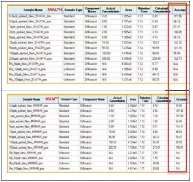 本實(shí)驗(yàn)前處理方法簡(jiǎn)單易行,很大程度上提高了工作效率;SAWTH?數(shù)據(jù)絕對(duì)響應(yīng)值比MRMHR大,但是MRMHR的信噪比大,選擇性更強(qiáng);對(duì)于SWATH®而言,不需要增加Cycle Time,能保證所有的化合物均采集到高質(zhì)量的二級(jí)質(zhì)譜圖,并且溯源性較強(qiáng);對(duì)于MRMHR而言,必須要預(yù)先得到目標(biāo)物的保留時(shí)間,并且需要把目標(biāo)物的保留時(shí)間和質(zhì)荷比輸入到列表中,如果化合物種類(lèi)較多,工作效率較低,而SWATH®不需要預(yù)先輸入保留時(shí)間和質(zhì)荷比,對(duì)于多殘留分析,大大提高了工作效率;本文對(duì)于采用高分辨質(zhì)譜定量分析常規(guī)藥物而言具有重要的參考意義。