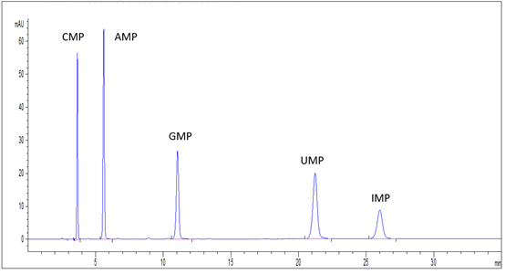 5種核苷酸混合標(biāo)準(zhǔn)溶液:分別稱取核苷酸標(biāo)準(zhǔn)品CMP、AMP、UMP各10mg、GMP、IMP各5mg(精確至0.1mg),用水溶解成并定容至100mL,混勻,即得;
