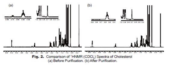 Because of the weak UV absorption property of cholesterol structure, the HPLC spectra are taken at 220nm, which looks like the better wavelength to reflect the purity of the product. HPLC spectra demonstrate that the major impurity at 5.43min (cholest-7-en-3-ol) is reduced from 0.49% to 0.06%, and the impurity at 5.95min is not observed after purification (Fig. 3-a, Fig. 3-b), the purity of cholesterol product is improved significantly to 99.9%.
