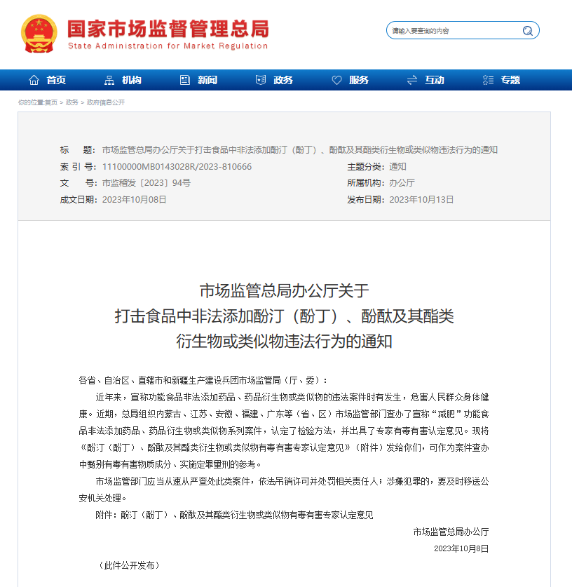 國家市場監(jiān)督管理總局發(fā)布關(guān)于打擊食品中非法添加酚?。ǚ佣。?、酚酞及其脂類衍生物或類似物違法行為的通知,加強了對食品中非法添加的監(jiān)管。