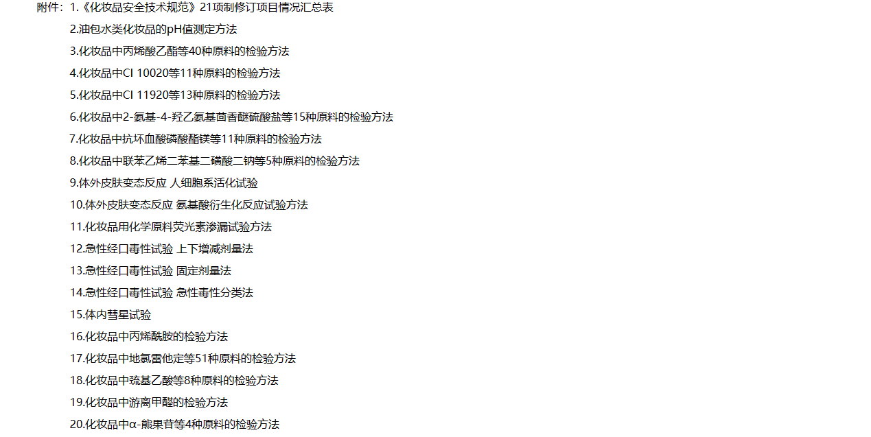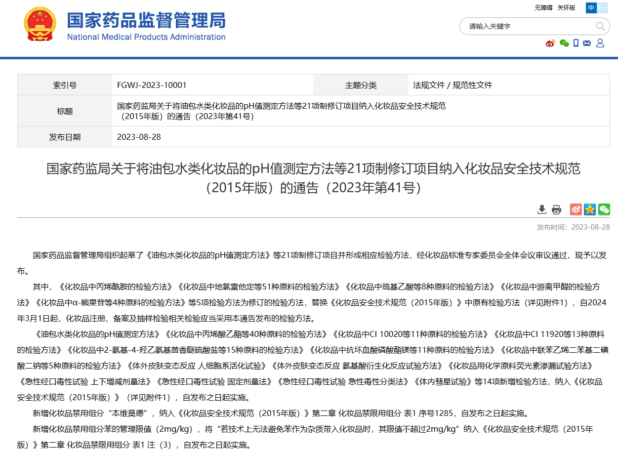 近日,國家藥品監(jiān)督管理局發(fā)布公告 將21項(xiàng)檢驗(yàn)方法納入化妝品安全技術(shù)規(guī)范(2015版),其中,替換5項(xiàng)檢驗(yàn)方法,新增14項(xiàng)檢驗(yàn)方法,并新增禁用組分“本維莫德”以及“苯”的管理限值(2mg/kg)。