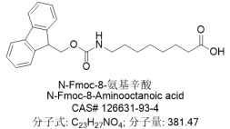 另外,GB 5009.150-2016和SN/T 3843-2014標準中將紅曲紅胺的CAS號3627-51-8寫為126631-93-4,而后者對應(yīng)的名稱為N-芴甲氧羰基-8-氨基辛酸(N-Fmoc-8-Aminooctanoic acid),對應(yīng)的結(jié)構(gòu)式見下圖。盡管該化合物的分子式和分子量與紅曲紅胺完全相同,導(dǎo)致二者在一級質(zhì)譜的分子離子峰完全相同(均為[M+H]+ = 382, [M-H]- = 380),然而二者的化學(xué)結(jié)構(gòu)卻差別巨大,因此其核磁譜圖和二級質(zhì)譜上的碎片離子峰有顯著差別,在HPLC上的出峰時間和UV吸收也有明顯的區(qū)別。檢測人員在標準物質(zhì)選擇、采購和使用中應(yīng)多加注意,避免產(chǎn)生錯誤的檢測結(jié)果。