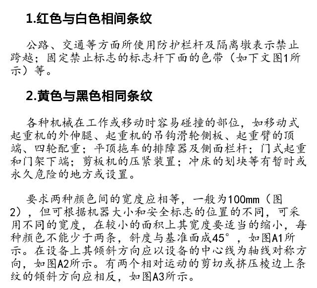 安全色與對(duì)比色相間的條紋寬度應(yīng)相等,即,各占50%。斜度45°寬100mm,每種顏色不少于兩條。